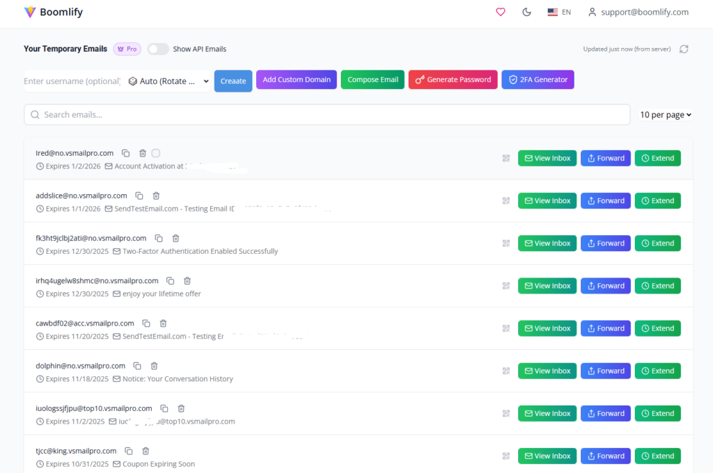 - Custom Domains (BYOD): For the ultimate professional look, you can connect your own private domain. This allows you to generate emails like support@yourbrand.com while using Boomlify’s interface to manage the mail. This is 100% undectectable as “temp mail.”